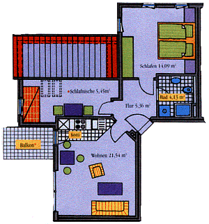 Im Schlafzimmer befinden sich ein Doppelbett und ausreichende Schrankmöglichkeiten. Eine weitere gemütliche Schlafmöglichkeit finden Sie in dem kleinen Kinderzimmer bzw. Gästezimmer, welches unter einer Dachschräge liegt. Das Zimmer ist mit einem Bett (0,90 x 2,00 m), einem weiteren Schlafsofa für ein Kleinkind bis maximal 10 Jahre und einem Schreibtisch eingerichtet. Zur Wohnung gehört weiterhin ein Duschbad.